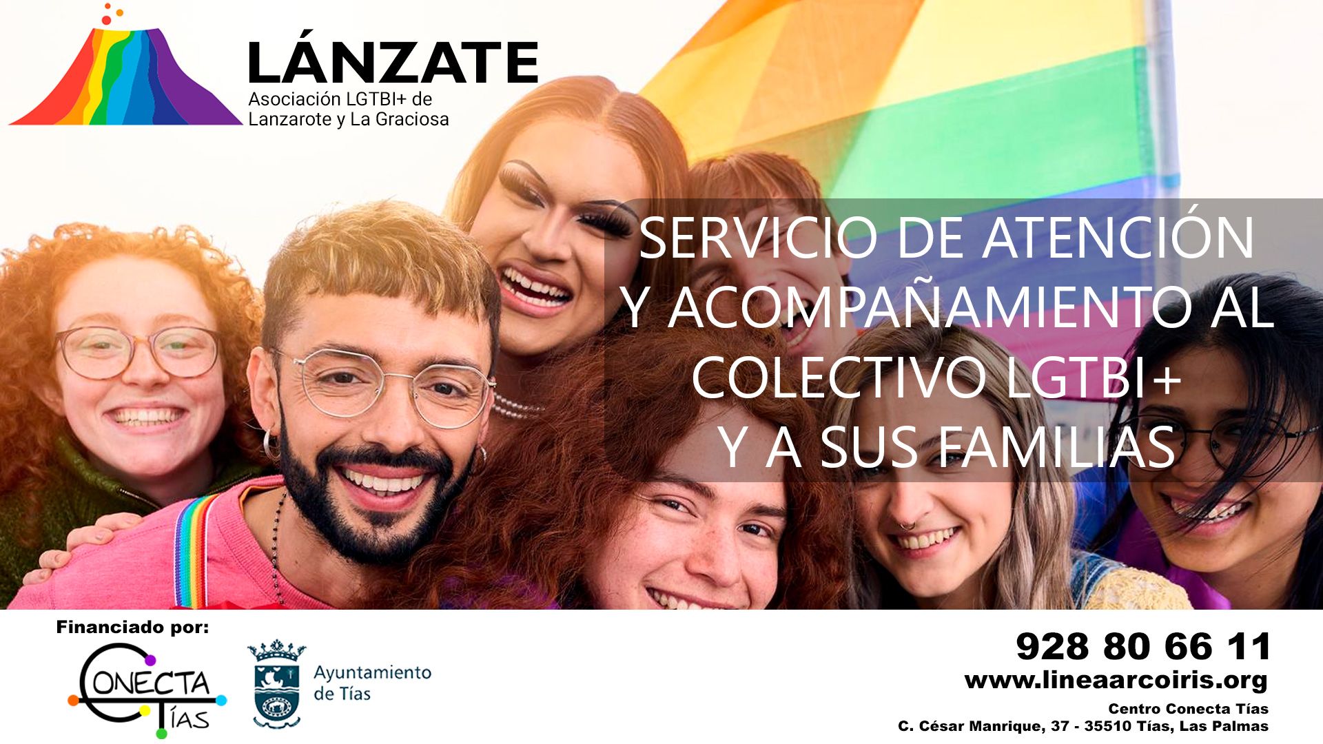 Desde Lánzate seguimos ampliando nuestra red de apoyo al colectivo LGTBI+ y a sus familias. Nos alegra anunciar que, gracias a la colaboración que mantenemos desde hace tiempo con el Ayuntamiento de Tías, hemos abierto una nueva antena de nuestro servicio Línea ArcoIris Integral en el Centro Conecta Tías, situado en la Calle César Manrique, 37, en Puerto del Carmen.